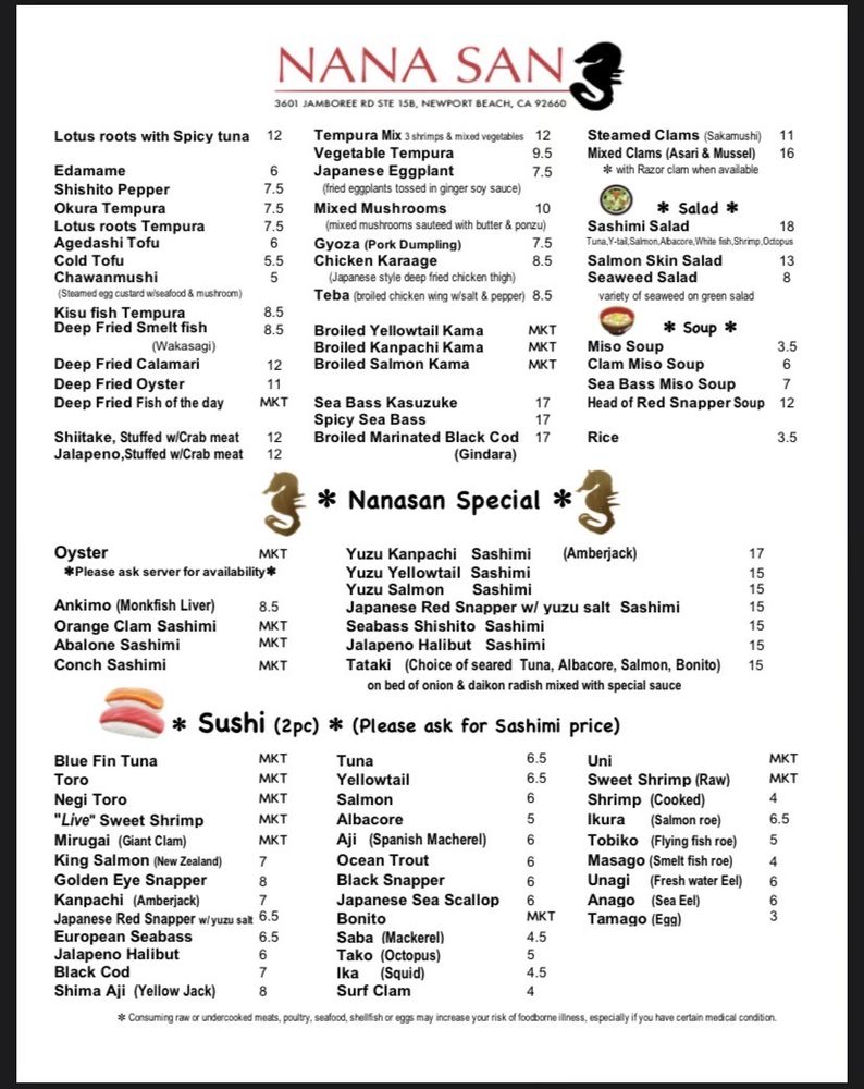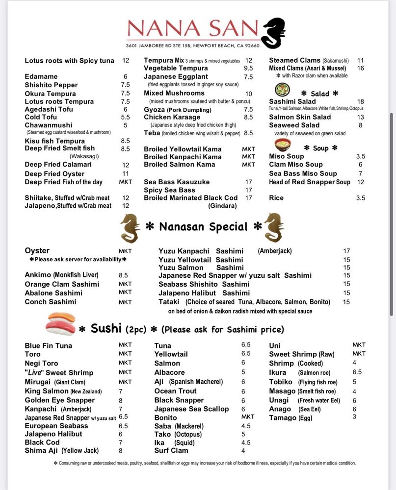 Nana San, a Japanese sushi bar in Newport Beach, CA, offers a menu filled with fresh and innovative dishes. Customers rave about the quality of the fish, with favorites like the omakase and salmon trio standing out. The chef's attention to detail shines through in each piece of sushi, like the striped jack with its unique sauces. Despite the bustling atmosphere, the service remains top-notch. While reservations are recommended due to the restaurant's popularity, the affordable prices for such high-quality food make Nana San a must-visit for sushi enthusiasts. Whether you're indulging in a 15-course omakase or simply enjoying some sashimi and nigiri, Nana San promises a delicious and memorable dining experience.
